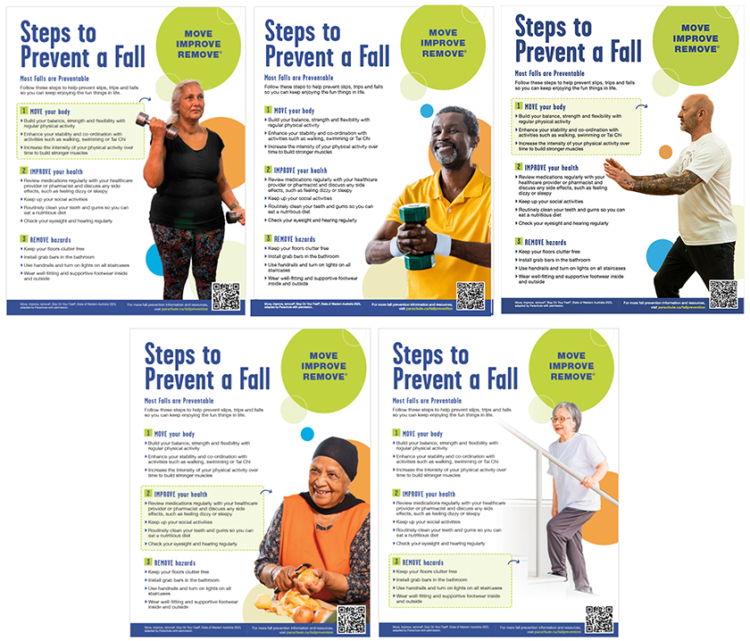 These posters promote healthy aging and fall prevention. They are aimed at older adults and designed to be posted in a variety of settings, such as hospitals, clinic waiting rooms, pharmacies, community buildings, long-term care and retirement facilities.